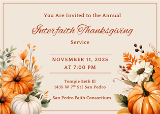 Join us for our annual San Pedro Faith Consortium Interfaith Thanksgiving Service. Our host congregation this year is Temple Beth El, and paricipants include St. Peter's Episcopal Church, The Garden Church, Good Shepherd Lutheran Church, First Presbyterian Church, San Pedro United Methodist, and local representatives from our Muslim, Bahai, and Hindu communities.